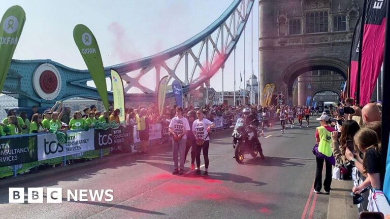 The Metropolitan Police said a member of London Marathon event staff intervened to remove the protesters from the path of the men’s elite race, which was able to pass unobstructed moments later.