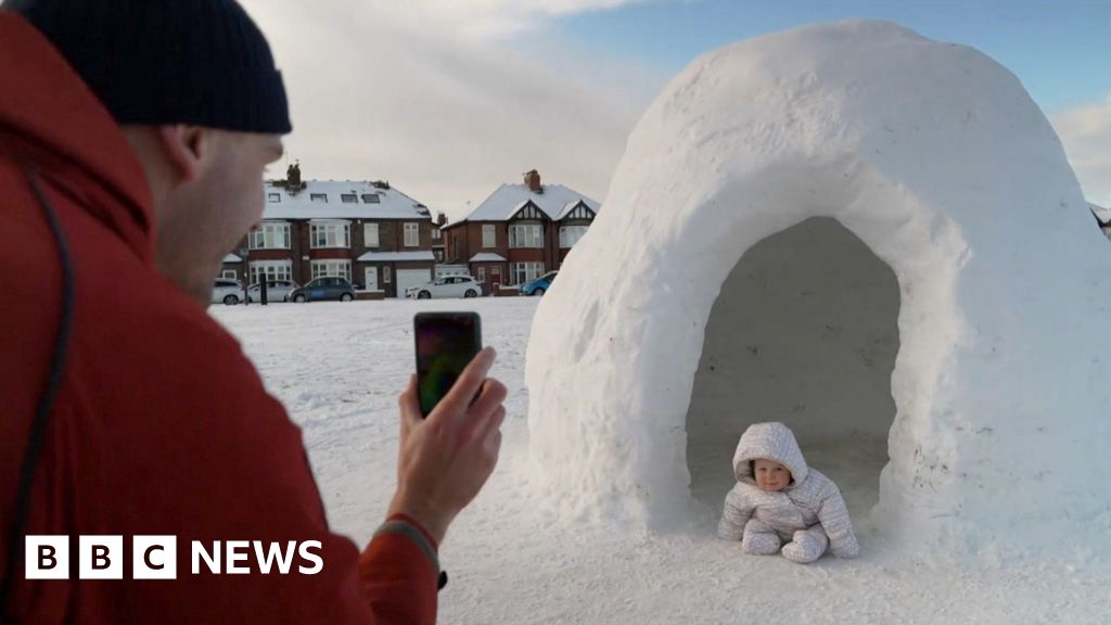 Brothers Isaac and Jakob Adams spent 15 hours building an igloo as snow hit the coast of north-east England.