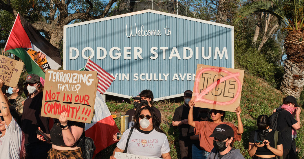 Demands on the Dodgers to call out the raids by Immigration and Customs Enforcement grew on Thursday, when federal immigration agents were seen near a Dodger Stadium parking lot. Protesters quickly descended outside the ballpark to protest.