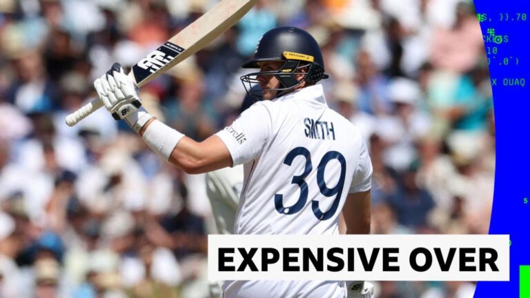 Jamie Smith hits five boundaries as England score 23 runs off one over against India on the day three of the second Test, moving the home side on to 160-5 in their first innings at Edgbaston.