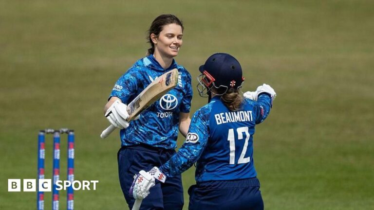 The century came from just 76 balls – England’s joint-third fastest in women’s ODIs – with Beaumont’s fifty coming from 64, before she kicked on to reach three figures from 106 balls with a six sent sailing over long-on.