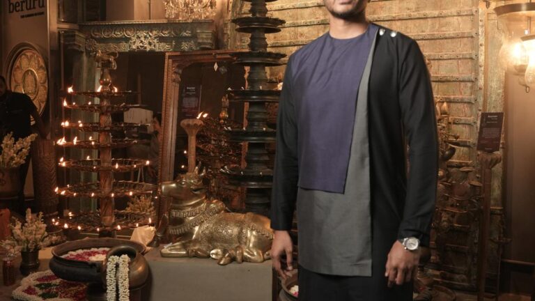 Radeesh says, “The collection unfolds a captivating narrative of light. It features carefully curated vintage oil lamps sourced from diverse regions of our country. My passion for lamps began in my early twenties. I tell everyone, instead of me searching for lamps, they find me. I was once trekking in Sri Lanka and I got a random offer from a man. He showed me beautiful brass lamps and asked if I would buy them. I told him I could not trek with the lamps; however, if he were back at the same spot in three hours (we would return to the spot from the trek) I would buy them. To my surprise he was there waiting for me. I bought the lamps and added them to my collection. They are beautiful rooster lamps that are used in meditation.”
