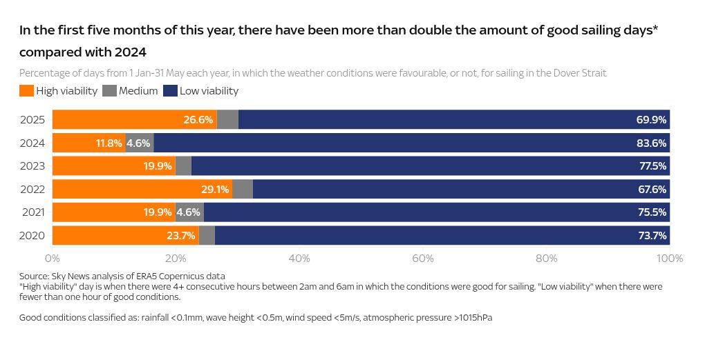 However, analysis by the Sky News data team shows that there has also been a big rise in crossings on days when the weather has been poor.