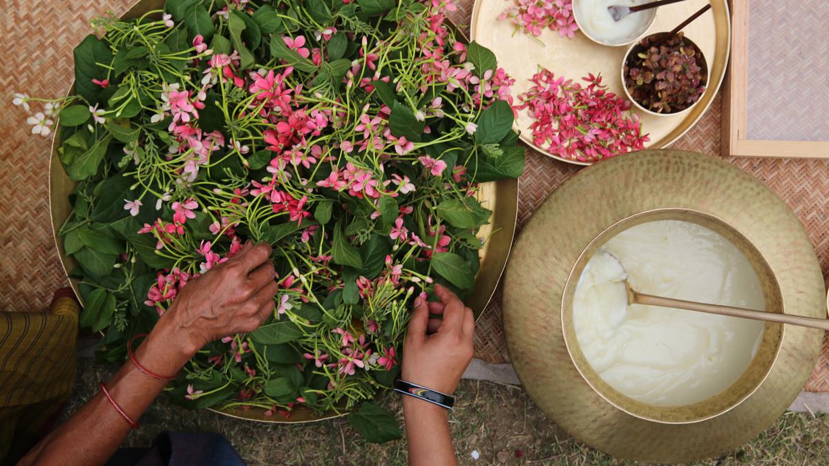 Members of the Forest Essentials team harvesting fresh flowers and herbs