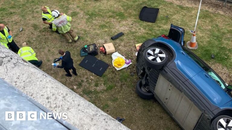 On Sunday, people at the scene told the BBC the car, with one man inside, appeared to turn the wrong way when exiting the car park before crashing to the ground.