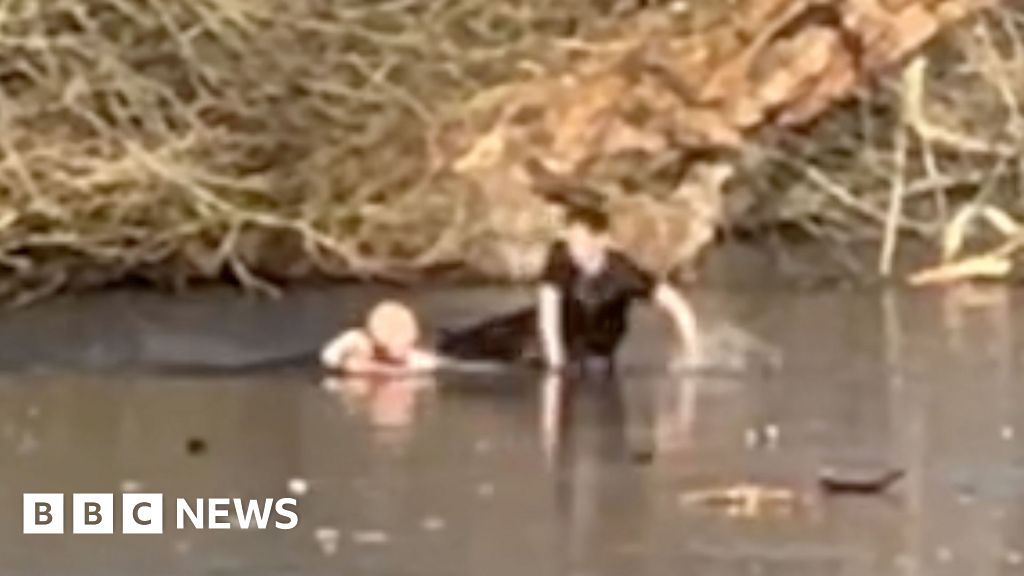 Footage captured by a member of the public shows two men struggling to escape after falling through ice at a frozen lake after an attempted dog rescue.