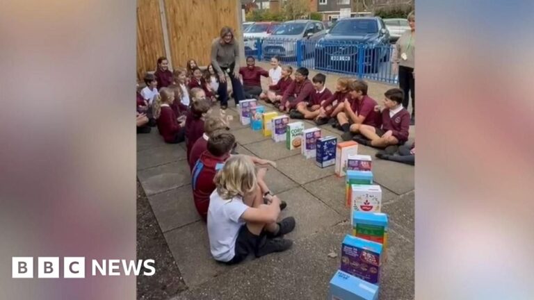 A primary school has shared footage of their pupils’ joy as they watch an impressive domino of cereal boxes toppling over.