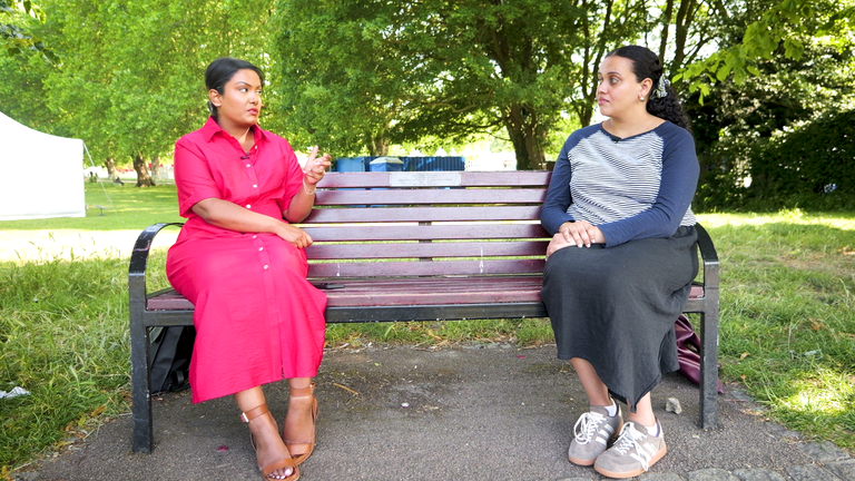 Faustine Petron (R) speaks to Sky’s Ashna Hurynag