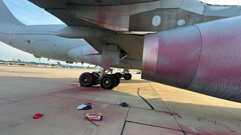 In a video shared online by Palestine Action earlier on Friday, a person can be seen approaching an aircraft on a scooter as music is played. Red paint can be seen on the ground.