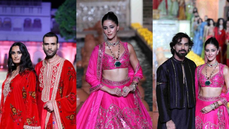 The fashion show, set against the backdrop of the iconic Rambagh Palace, featured a ramp lit by numerous candles, with waterfalls and a waterbody adding to the appeal. The clothes matched the setting with dramatic silhouettes, flairs that made the models twirl, and elaborate gota, coin, and chaandi tille embroidery that add a festive feel. Ananya Panday closed the show in a gulaabi gulal lehenga, a shade of pink that clearly seems to be Punit’s favourite.
