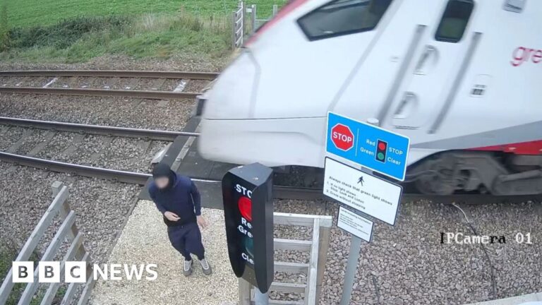 He is seen approaching the line and waiting for the oncoming Greater Anglia service before stepping back just before it speeds past.