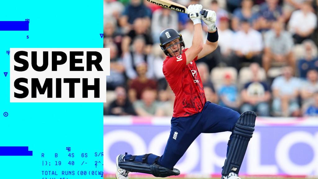 Jamie Smith scores 60 runs off 26 balls, including five sixes, to put England in a commanding position in the third T20 against West Indies in Southampton.