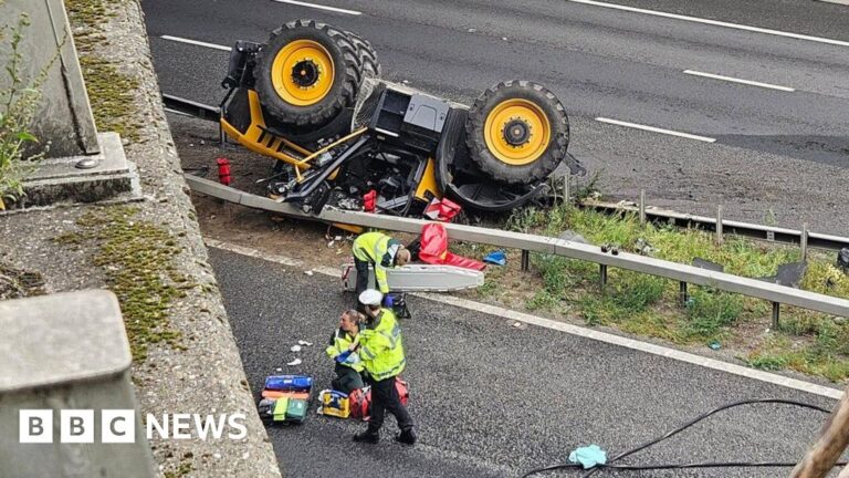 A man has been airlifted to hospital with serious injuries after a tractor fell off a bridge and on to the central reservation of the M20 in Kent following a crash.