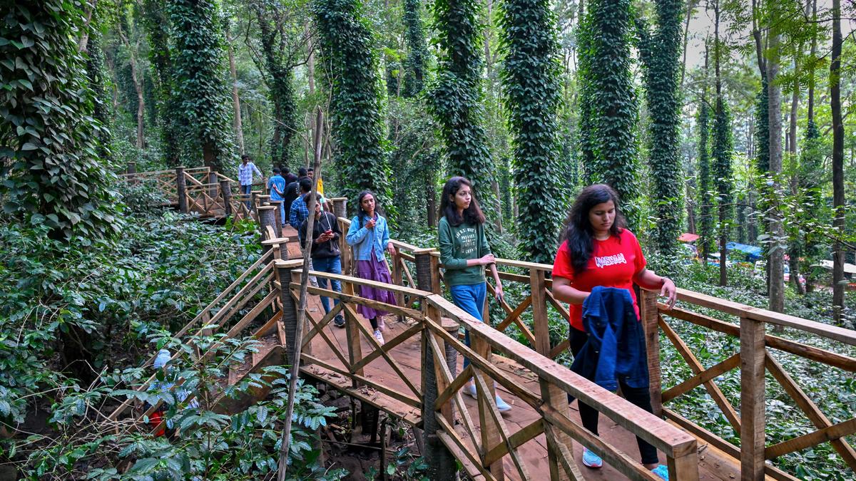 People walking through coffee plantations on the new wooden bridge developed by AP Forest Development Corporation close to Galikonda viewpoint, near Araku, 150 kilometres from Visakhapatnam.