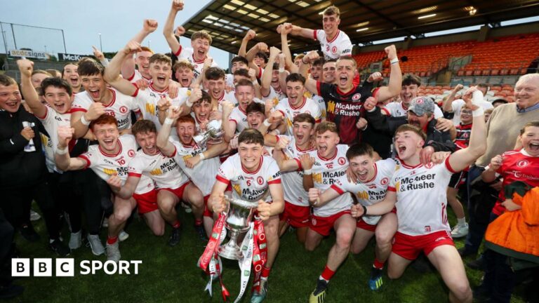 Tyrone: C McGarvey; F Nelis, B Hughes, C Devlin; C Daly, J Clarke (0-1), C Donnelly (0-1); C Devlin, C O’Neill (0-1); C Sheehy, E McElholm (2-4), M Quinn; N Grimes (2-6), R McCullagh (0-2 1f), L Og Mossey.