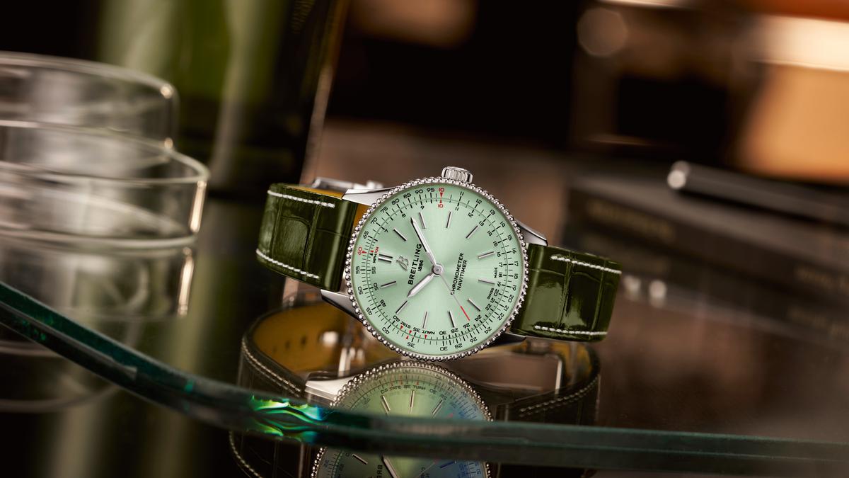 The 36 mm Navitimer retains its signature look by featuring the beaded bezel and iconic circular slide rule (used by pilots as an analog calculator). It is now presented in three chic metallic dial colours of mint green, silver, and anthracite with baton indices, or with a white mother-of-pearl dial set with round-cut diamonds.