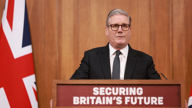 Keir Starmer announced the changes at a podium with ‘securing Britain’s future’ on the front. Pic: PA