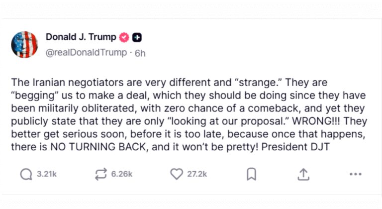 On the morning following the videos, Donald Trump posted on Truth Social, intensifying his rhetoric around the negotiations.“The Iranian negotiators are very different and ‘strange’. They are ‘begging’ us to make a deal… and yet they publicly state that they are only ‘looking at our proposal’. WRONG!!!” he wrote.“They better get serious soon, before it is too late, because once that happens, there is NO TURNING BACK, and it won’t be pretty!”