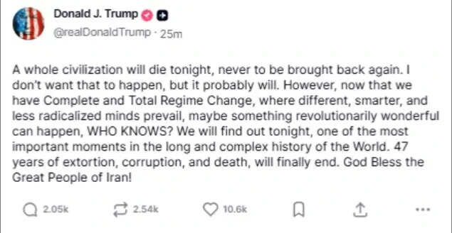 US president Donald Trump on Tuesday gave a stark warning to Iran as his ultimatum to open the Strait of Hormuz, saying “whole civilisation will die tonight”.“A whole civilization will die tonight, never to be brought back again. I don’t want that to happen, but it probably will. However, now that we have Complete and Total Regime Change, where different, smarter, and less radicalized minds prevail, maybe something revolutionarily wonderful can happen, WHO KNOWS?” said the US president on Truth Social.