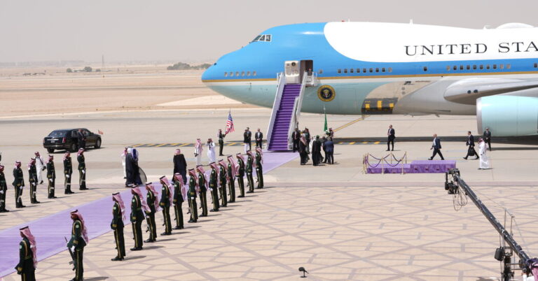 No, don’t call it purple. When President Trump disembarked from Air Force One in Saudi Arabia on Tuesday, he stepped onto the rich lavender-colored carpet unfurled before him, just one feature of the lavish welcome extended to the visiting American leader on the first day of his Gulf tour.